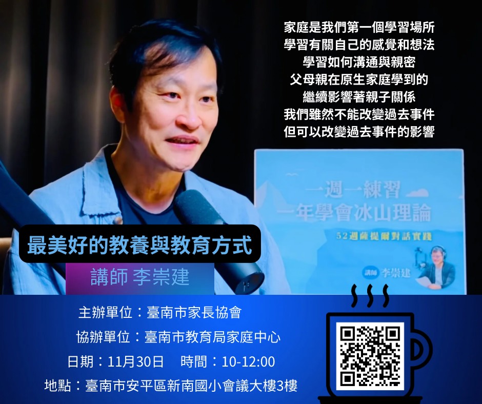 一、講座內容:邀請李崇建講師以薩提爾對話模式為核心,透過演講與實例分享,引導參加學員理解情緒背後的需要,並學習在互動中以尊重、好奇及接納,取代指責與衝突。