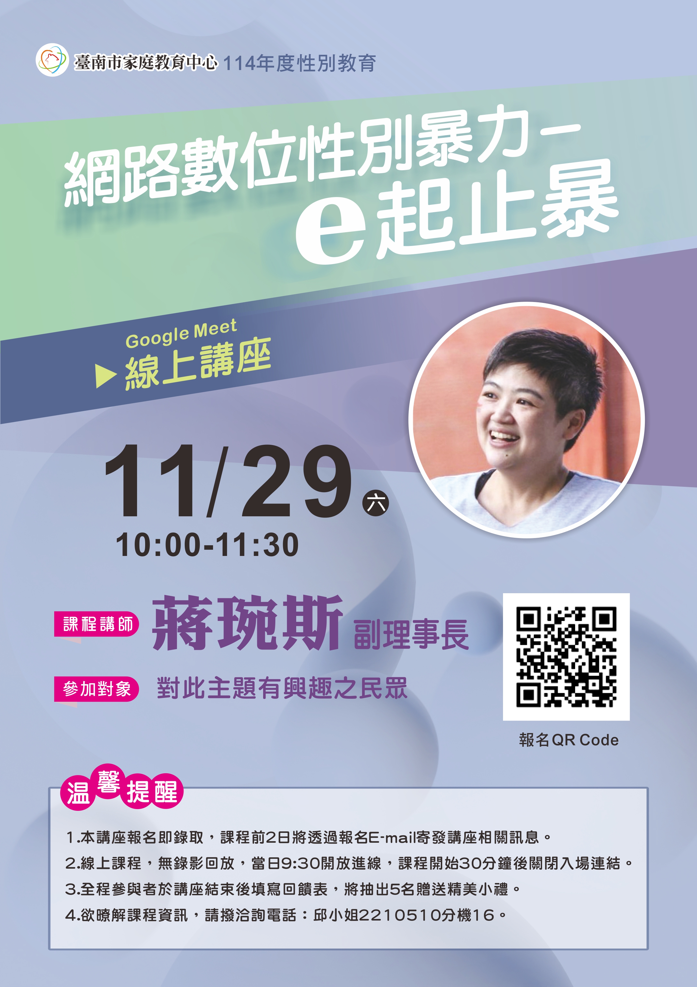二、為提升民眾e世代數位素養及性別暴力防制觀念,特舉辦旨揭線上講座。